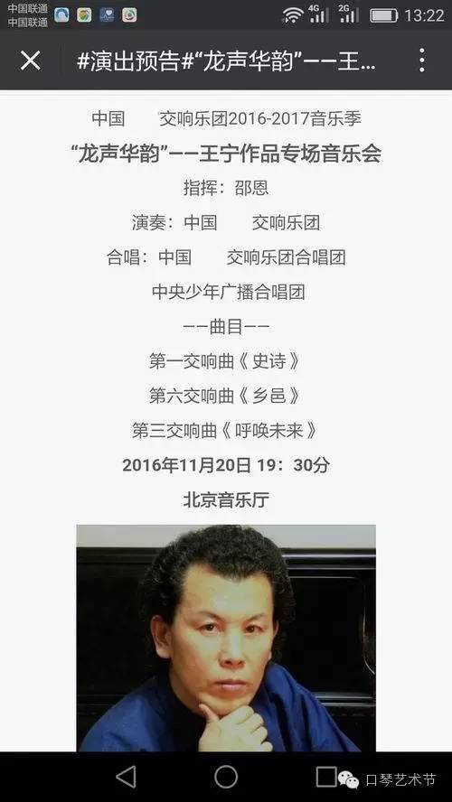 那是在2016年11月19日的早上7:30,我被电话声吵醒。这是周六。电话里传来急促而熟悉的曾在中国文联工作过的林大姐的声音,她让我赶紧起床,10:00去中国交响乐团排练,有一个交响曲需要口琴,明天晚上要在北京音乐厅正式演出。我当时还在睡梦中,迷迷糊糊的,以为她跟我开玩笑呢!可她接着问我几点去接她,我才猛然意识到这是真的了……我飞快地洗刷完毕,匆匆忙忙准备口琴。由于林大姐没告诉我用啥口琴,啥调的,我只好带着一套“东方鼎”套琴及一只半音阶口琴赶往中国交响乐团排练厅。在路上我跟林大姐说,我很忐忑,我经常跟口琴团队演出或者跟录音伴奏吹,但从来没跟这么的交响乐团一起演奏过,吹什么旋律,多大难度我都不知道,我会很紧张的。她说以前听过我的口琴演奏,觉得肯定能胜任。