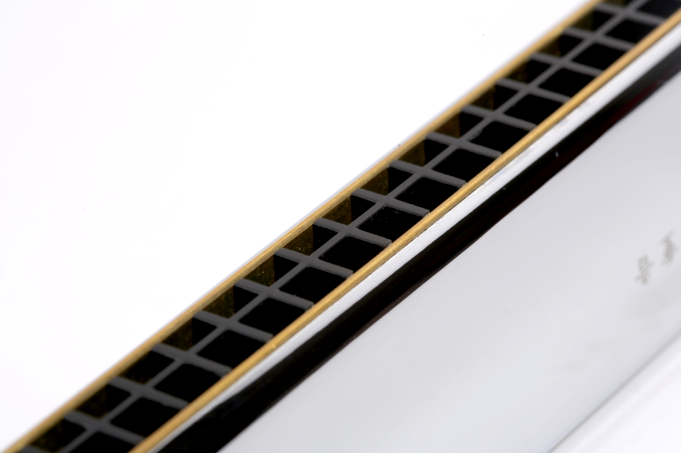 口琴的“心脏”--音簧,材料采用的是青铜合金制成,电焊工艺,让黄片更加贴合座板,更加牢固。不易产生砂音、哑音。