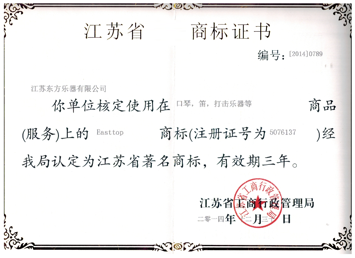 喜讯:江苏东方乐器有限公司的Easttop商标被工商行政管理部门认定为江苏省