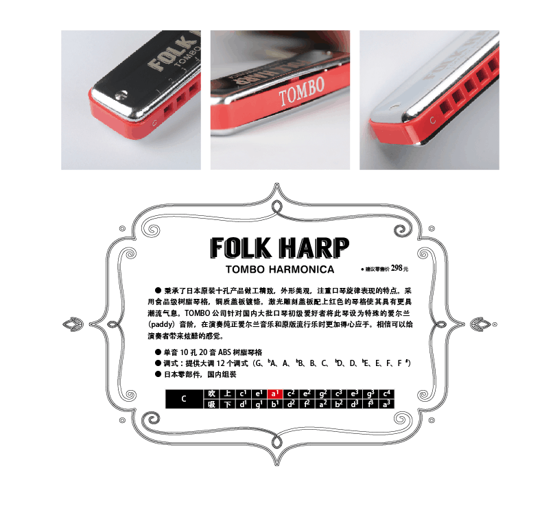 秉承了日本原装十孔产品做工精致,外观精美,注重口琴旋律表现的特点。采用食品级树脂琴格,铜制盖板镀铬。激光雕刻盖板配上红色的琴格使其更具有潮流气息。TOMBO公司针对国内大批口琴初级爱好者将此琴设为特殊的爱尔兰(paddy)音阶,在演奏纯正的爱尔兰音乐和原版流行乐时得心应手。相信可以给演奏者带来炫酷的感觉。