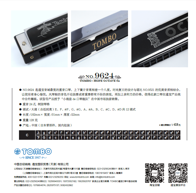NO.9624 是通宝音域宽的重音口琴,上下簧片音高相差一个八度。时尚复古的设计与堪比NO.9521的优美音质相结合,让使用者身心愉悦。风琴般的音色不论独奏或者重奏都有不俗的表现,再加上亲和力的价格,使得此款口琴在通宝产品线中分外耀眼。 该型号产品授予“小海盗de口琴舰队”在中国市场销售。