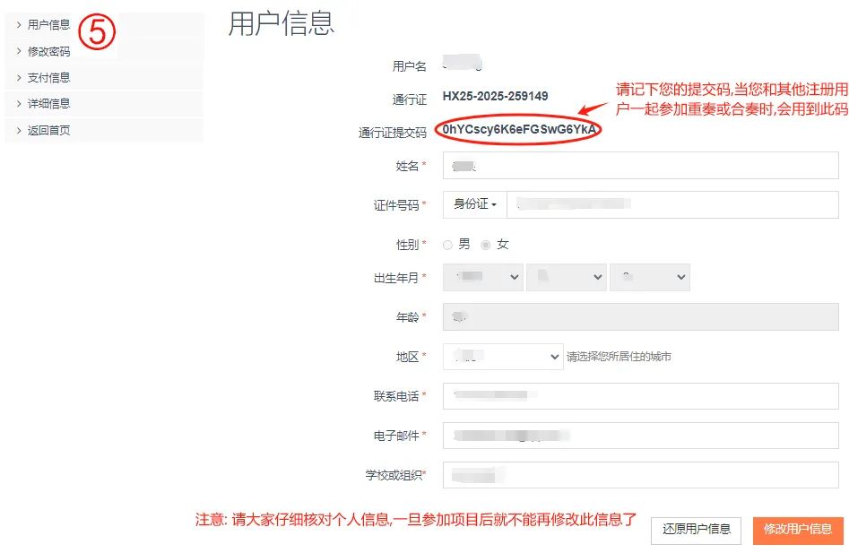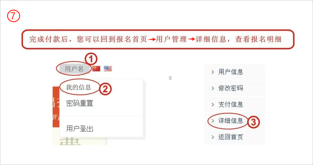 第七步:完成付款,回到报名首页,点击“用户名”--“我的信息”--“详细信息”