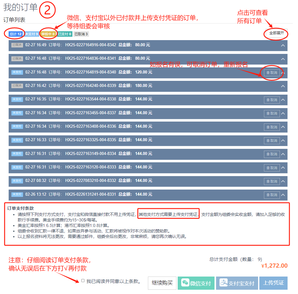 第二步:请在“订单列表”中查看您的订单,点击“全部展开”可看到订单内容,如果您发现某个订单不需要了,可点击该订单上的“取消”,或者您发现该订单有误,那么你也可以点击“取消”然后重新再报(前提是未付款)。并且仔细阅读订单条款内容,确认无误打钩,按提示完成付款。(付款方式参考购买通行证的付款步骤)